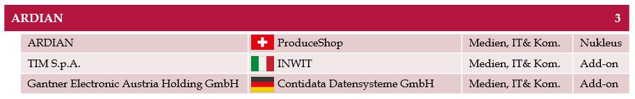 Mit insgesamt 3 gezählten Deals im Juni belegt der Private Equity Investor ARDIAN, wie bereits im vorigen Monat, Platz 2 in unserem Ranking. Auch ARDIAN beteiligte sich an einem schweizer IT-Unternehmen. Mit der direkten Beteiligung in ProduceShop akquiriert ARDIAN den Online-Shop der ECommerce-Plattform. Die weiteren Deals fanden als Add-on-Akquisitionen, ebenfalls im Bereich Medien, IT & Kommunikation, statt. Über das Portfoliounternehmen TIM S.p.A. hat ARDIAN sich an dem italienischen Unternehmen INWIT beteiligt. Außerdem wurde durch die Gantner Electronic Austria Holding GmbH die Contidata Datensysteme GmbH mit Sitz in Deutschland übernommen.