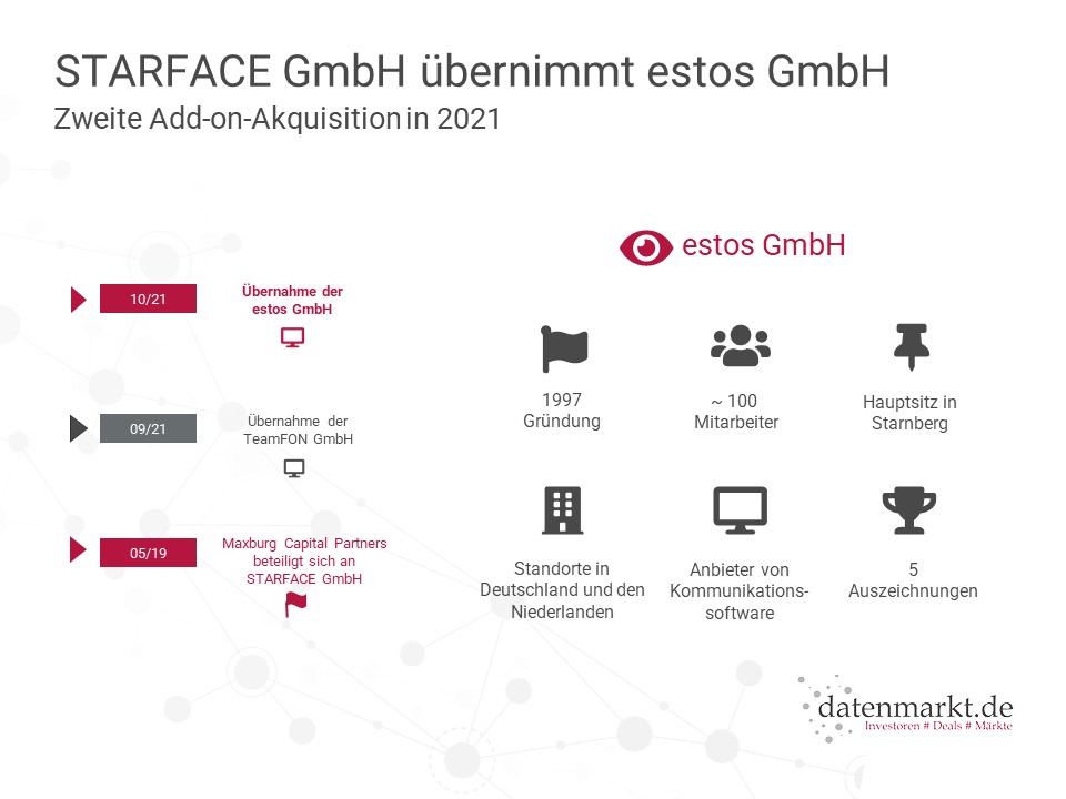 STARFACE, ein Portfoliounternehmen von Maxburg Capital Partners hat bekannt gegeben, dass die estos GmbH ab sofort unter dem Dach der SF Technologies Gruppe als Schwestergesellschaft der STARFACE GmbH und der TeamFON GmbH aus München agiert. Die langjährigen Geschäftsführer Christoph Lösch und Florian Bock werden auch künftig für die Leitung von estos verantwortlich zeichnen. Über den Kaufpreis wurde Stillschweigen vereinbart.